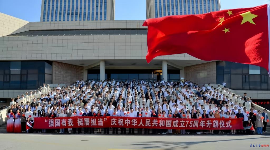 10月1日上午,我校在浮山校区和金家岭校区同时举行“强国有我 挺膺担当”庆祝中华人民共和国成立75周年升国旗仪式。伴随着雄壮的国歌,五星红旗冉冉升起,迎风飘扬。在鲜艳的国旗下,青年学生代表通过主题朗诵以青春的名义,向祖国献礼,全体学生立下了“强国有我 挺膺担当”的青春誓言并合唱《我爱你中国》。