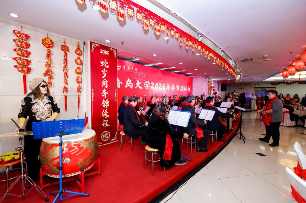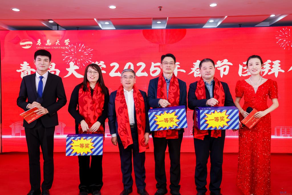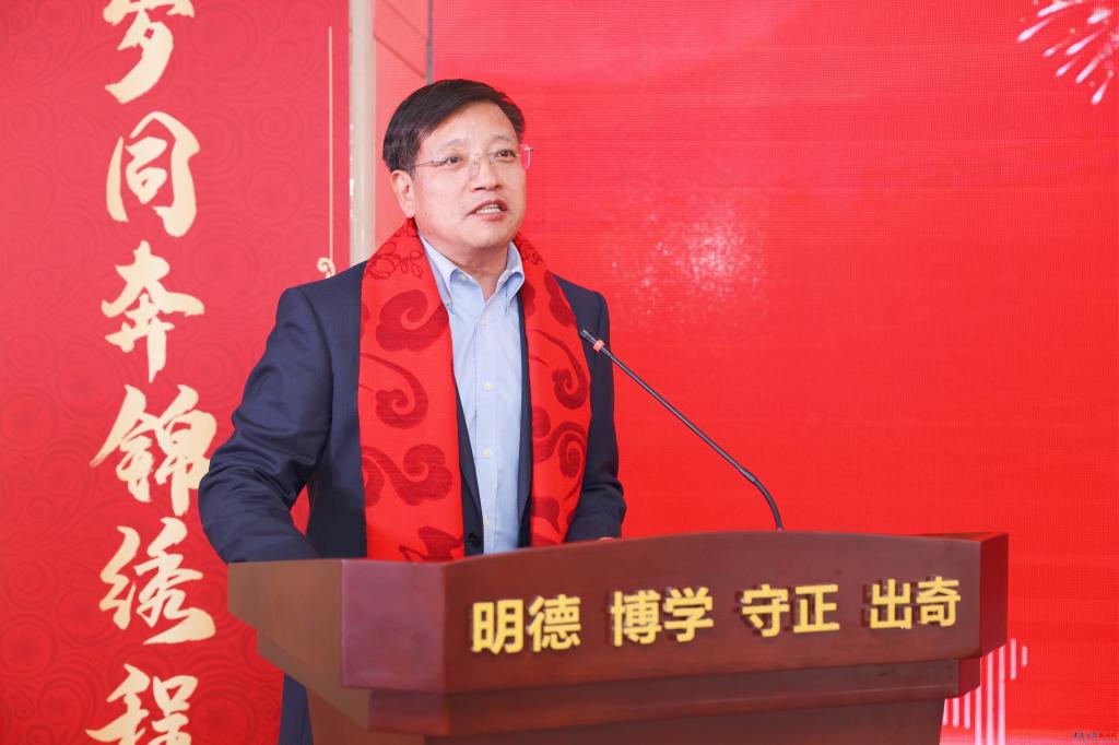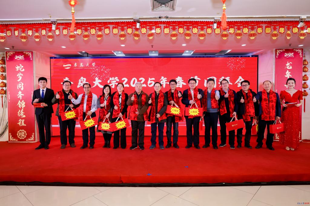 校党委书记胡金焱致新春贺词。他指出,2024年学校深入贯彻落实党的二十大和二十届二中、三中全会精神,全面落实教育强国和教育强省战略,聚力转型发展、创新发展、突破发展,继往开来,积厚成势,在高质量发展的道路上奋勇前进。他全面总结了学校过去一年在学科建设、人才培养、科学研究、社会服务、文化传承创新、国际交流合作等方面取得的成绩,通报了学校事业发展取得的标志性突破性成果。胡金焱表示,这一系列办学成绩的取得,离不开每一位青大人的倾情投入、接续奋斗,他代表学校向一年来辛勤工作在教学、科研和服务等各条战线上的广大教职员工表示衷心的感谢,向关心学校发展并为学校事业不断做出新贡献的老领导、老同志、老专家致以崇高的敬意和新春的祝福。胡金焱强调,2025年是学校全面落实第四次党代会精神的重要一年,是实现“十四五”规划目标任务的收官之年,也是全面提升办学能力、加快推进“双一流”建设的关键一年。学校上下要锚定目标、坚定信心,以敢打必胜的勇气、久久为功的韧劲,践行青大人的使命担当,奋力开创高水平综合性研究型大学建设新局面。