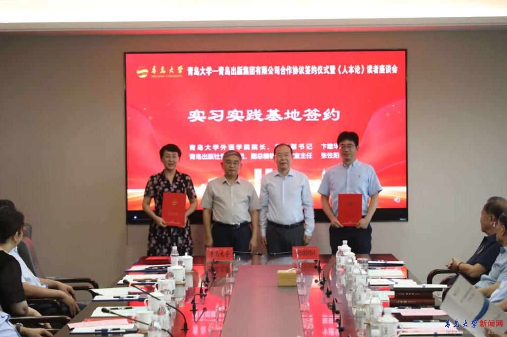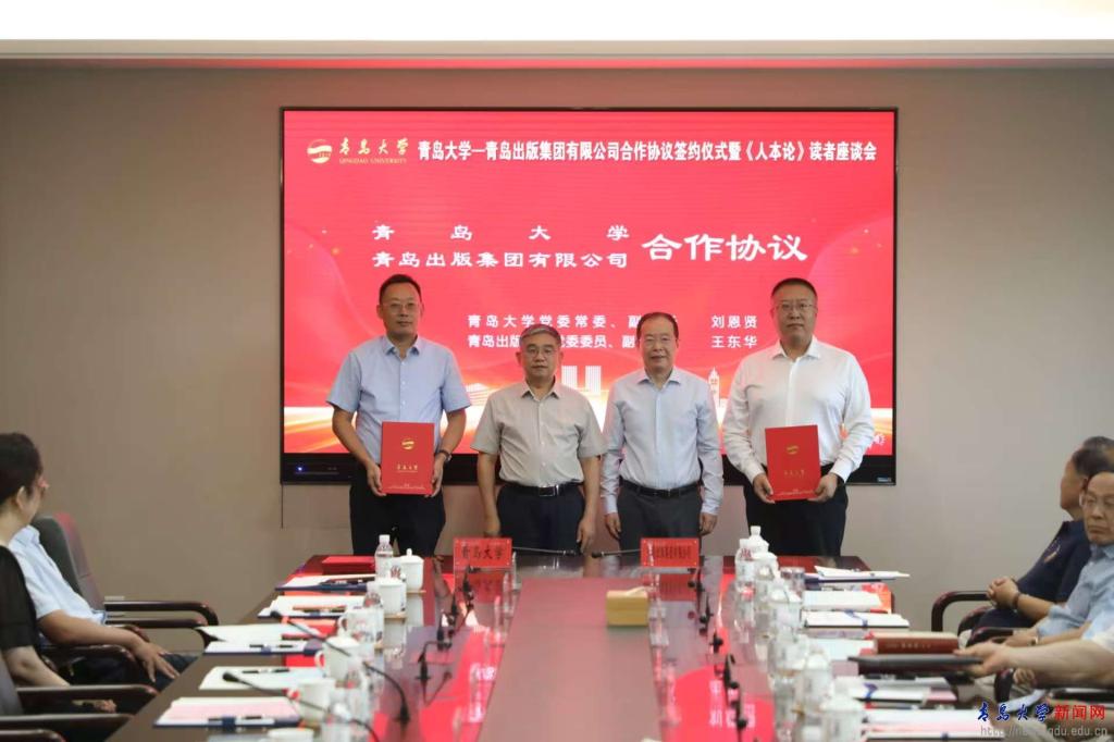 新闻网讯 8月6日,我校与青岛出版集团有限公司合作协议签约仪式暨《人本论》读者座谈会在学校会议中心致远厅举行,校党委书记胡金焱出席活动。青岛出版集团有限公司党委书记、董事长贾庆鹏,青岛出版集团党委委员、副总经理,青岛出版社党委书记、董事长王东华参加活动。仪式由校党委常委、副校长刘恩贤主持。