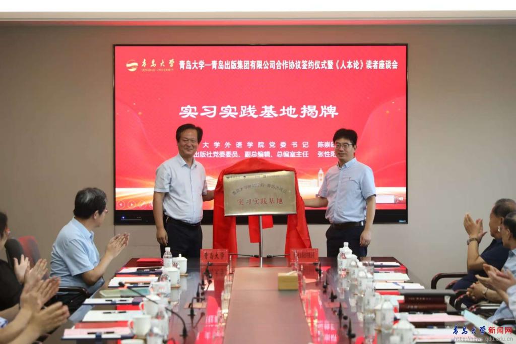 外语学院党委书记陈崇研与张性阳共同为“开运电竞,赛事在呼唤,智胜在手心外语学院—青岛出版集团有限公司实习实践基地”揭牌。