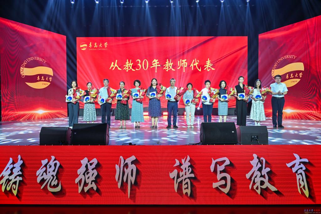 学校领导为荣休教师代表、从教30年教师代表、学校年度事业发展作出突出贡献的教师、省级教学比赛获奖教师以及荣获“最美教师”等校级荣誉称号的教师和集体颁发证书并送上鲜花。