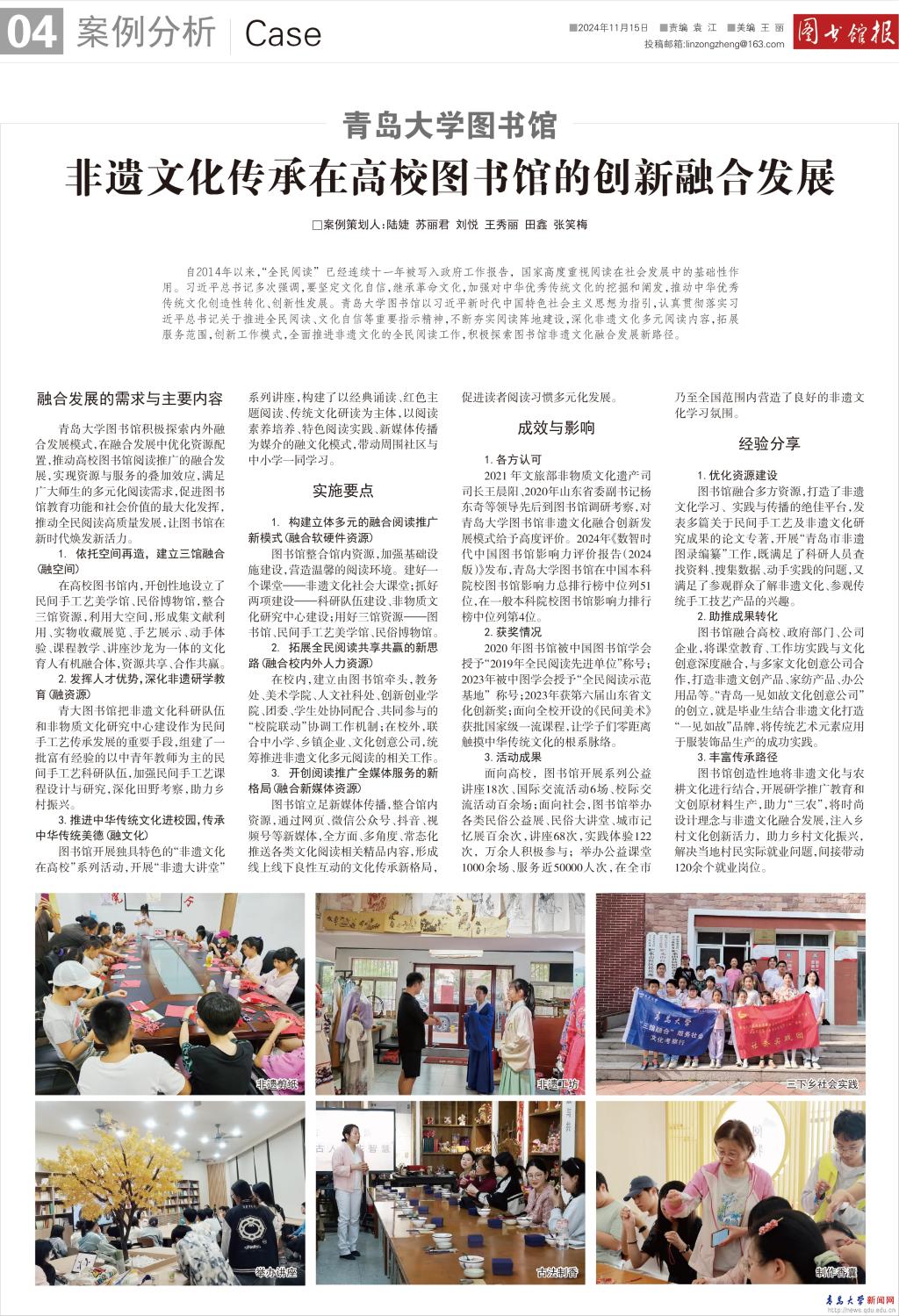新闻网讯 近日,《图书馆报》总第718期第4版整版刊发我校图书馆题为《非遗文化传承在高校图书馆的创新融合发展》的文化创新案例。该案例由我校图书馆党委书记、馆长陆婕带领团队完成,今年5月入选该报“2024图书馆融合发展典型案例”。