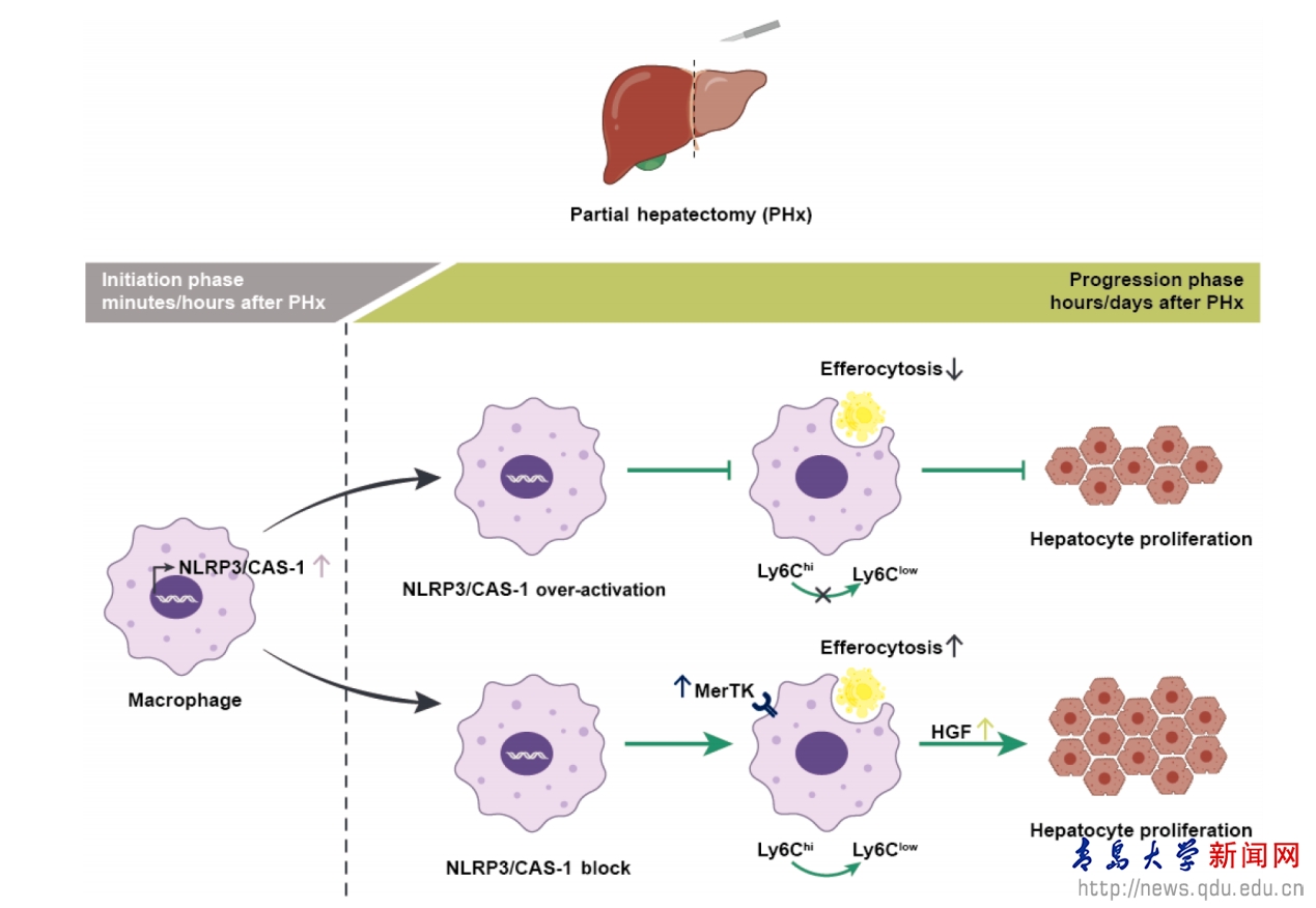 新闻网讯 近日,基础医学院狄国虎、陈鹏教授课题组团队在Science子刊ScienceAdvances杂志在线发表了题为“NLRP3 Inflammasome Constrains Liver Regeneration Through Impairing MerTK Mediated Macrophage Efferocytosis”的研究论文(IF=11.7,DOI: 10.1126/sciadv.adq5786)。该研究揭示了巨噬细胞NLRP3炎症小体在限制肝脏再生中的重要作用,并为靶向NLRP3提供了新的治疗策略。2020级特种医学硕士研究生韦素素(现就职于齐鲁中科现代微生物技术研究院)、开运电竞,赛事在呼唤,智胜在手心附属医院器官移植中心副主任医师关鸽、2021级特种医学硕士研究生栾晓瑜(现博士就读于中国科学院遗传与发育生物学研究所)、2021级特种医学博士研究生于超群为共同第一作者。基础医学院狄国虎教授、陈鹏教授为共同通讯作者。基础医学院为第一完成单位和唯一通讯单位。该研究受到科技部重点研发计划、山东省自然科学基金、山东省高校青创团队计划、青岛市科技惠民师范专项和开运电竞,赛事在呼唤,智胜在手心“医学+”课题等项目的资助。
