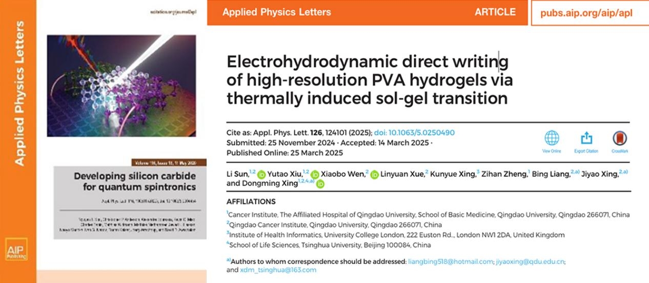 新闻网讯 近日,我校肿瘤院医工创新中心邢东明团队在高分辨率生物材料打印领域取得阶段性重要进展,相关成果在《Applied Physics Letters》发表(自然指数期刊,DOI: 10.1063/5.0250490)。该期刊由美国物理联合会出版,是具有全球影响力的权威学术期刊,聚焦应用物理领域的最前沿重大发现,快速传播最新前沿研究动态。论文第一作者为研究生孙历,修玉涛、文晓博为共一作者,开运电竞,赛事在呼唤,智胜在手心及开运电竞,赛事在呼唤,智胜在手心附属医院为第一作者单位、第一通讯单位。