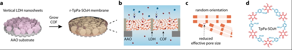 实现高选择性的锂离子筛分对于解决锂资源短缺等难题具有重要意义。然而,由于尺寸及价态等性质相近,从多种高浓度竞争离子(钠、钾、镁、钙离子)中精准提取锂离子面临极大的挑战。前人发展了多种膜材料用于提锂,这些材料可以让锂离子选择性透过,但选择性远不足以满足海水提锂需求。本文研究团队则反其道而行之,通过构筑随机取向共价有机框架(COF)基膜材料(图1),发展了一种可精准截留锂、传输其他阳离子的分离膜用于海水和盐湖水提锂,选择性接近完美。
