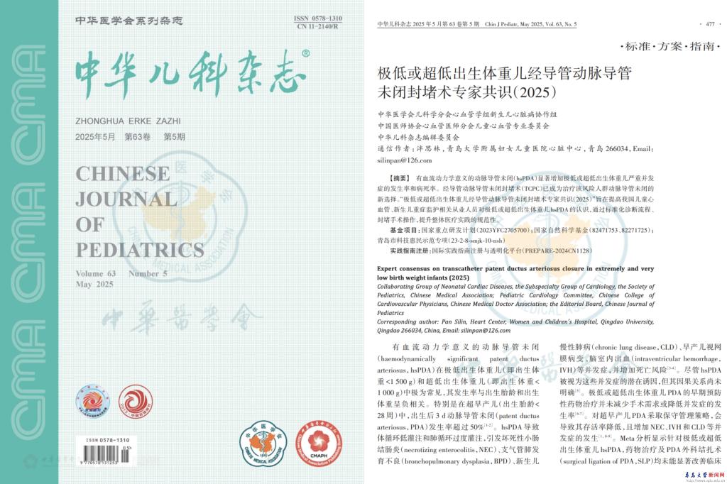 作为国内首个针对极低/超低出生体重儿动脉导管未闭(PDA)介入治疗的规范性指导文件,该共识从术前评估、手术适应证、操作规范及围术期管理在内的各个环节,进行了全面、系统、深入的阐述,为临床医生提供了详细、科学、实用的诊疗指导。特别值得关注的是,共识中提出的“青岛方案”创新性地解决了超低体重儿介入治疗的技术难题,为出生体重<1000g的危重新生儿提供了安全有效的治疗选择。