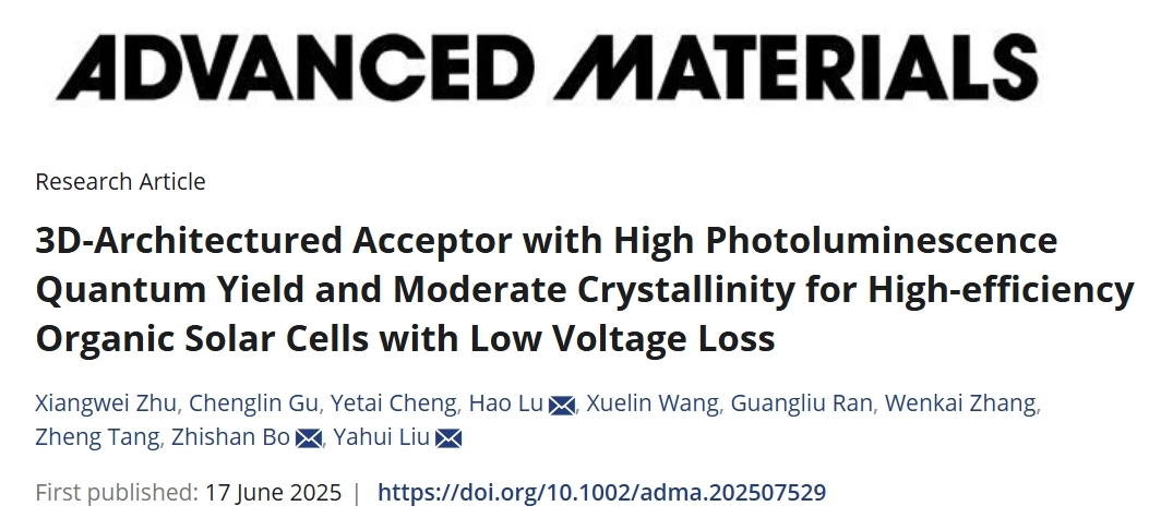 新闻网讯 近日,纺织服装学院薄志山教授、刘亚辉教授、祝向伟教授和材料科学与工程学院路皓副教授,在国际知名期刊Advanced Materials上发表题为“3D-Architectured Acceptor with High Photoluminescence Quantum Yield and Moderate Crystallinity for High-efficiency Organic Solar Cells with Low Voltage Loss”的研究型文章,我校研究生谷承霖和博士生成叶太为论文的共同第一作者。