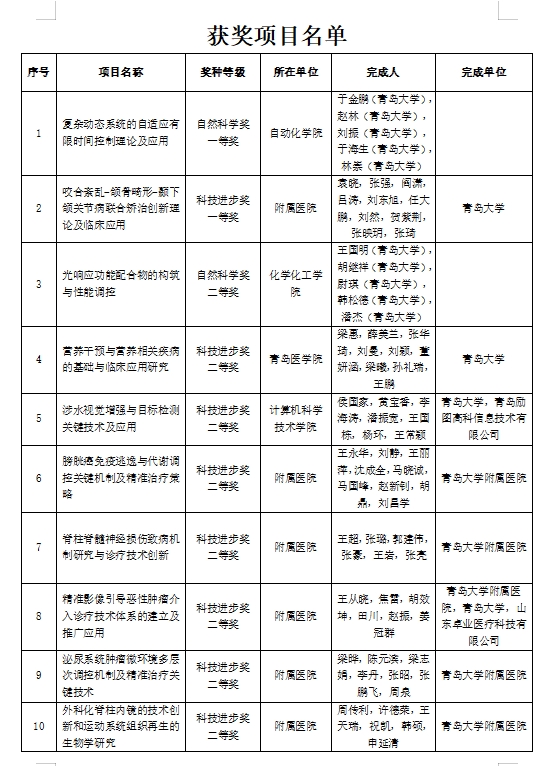 我校共获2024年度青岛市科学技术奖19项,第一完成单位获奖12项,其中一等奖2项、二等奖10项。自动化学院于金鹏教授团队完成的“复杂动态系统的自适应有限时间控制理论及应用”项目荣获自然科学一等奖,该成果在复杂动态系统控制理论方面取得重要突破,为智能制造等领域提供了重要的理论支撑。附属医院袁晓教授团队完成的“咬合紊乱-颌骨畸形-颞下颌关节病联合矫治创新理论及临床应用”项目获得科技进步一等奖,该项目创新性地提出了联合矫治理论,显著提升了相关疾病的诊疗效果。
