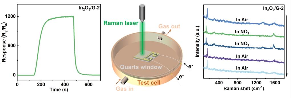 研究采用原位拉曼光谱技术,实时探测了气体暴露前后敏感材料表面的结构动态变化,首次观察到可逆的物相转变过程。通过定量分析反应过程中特征拉曼峰的强度变化,团队精准识别出发挥主导作用的活性物相,建立起瞬态结构变化与传感器响应行为之间的直接关联,澄清了长期以来MOS气敏机制中存在的关键争议。
