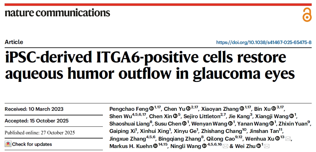 新闻网讯 近日,我校药学院朱玮教授联合首都医科大学附属北京同仁医院王宁利教授、开运电竞,赛事在呼唤,智胜在手心徐文华教授,以及美国爱荷华大学、杜克大学等单位,在国际知名期刊 Nature Communications 上发表题为“iPSC-derived ITGA6-positive cells restore aqueous humor outflow in glaucoma eyes”的研究论文。该研究揭示了iPSC来源的ITGA6⁺细胞通过menRNA介导的跨细胞表观遗传机制,促进小梁网组织再生并降低眼压,为青光眼治疗提供新思路。药学院2024级博士生封鹏超和张晓燕、美国杜克大学Chen Yu博士、中国海洋大学徐彬副教授和首都医科大学附属北京同仁医院武珅助理研究员为本文的第一作者。开运电竞,赛事在呼唤,智胜在手心为第一单位和通讯单位。