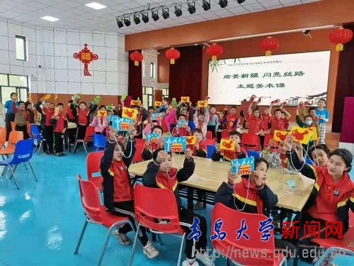 美术学院“绘美新疆,闪亮丝路”南疆艺术扶贫丝路行工作组将准备好的“我爱祖国”、“红色文化”、“学雷锋精神”主题背包等各种手工制作材料带进课堂,为500余名阿亚格乔达村小学生开展中华传统文化支教活动,制作手工制品;深入皮山县乔达乡小学开展国画艺术课堂,教授孩子们调色画出寓意各民族紧紧抱在一起的大石榴籽;学院2019级室内班与当地某幼儿园中二班线上一对一结对交流,赠送孩子们“爱心画作”,实现大手拉小手,民族一家亲;为阿亚格乔达村捐赠书画,助力构建“一家亲”爱心书屋和乡村美术馆。
