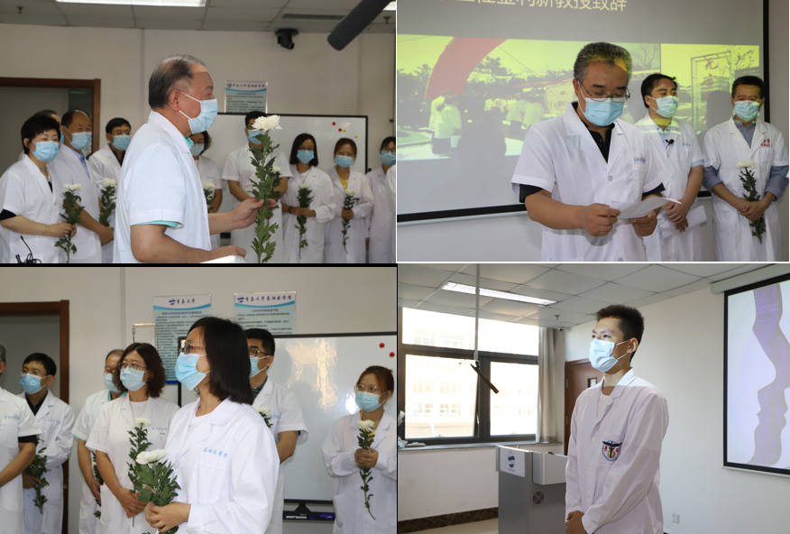 王双燕老师带领同学们宣读了解剖学誓词。无言良师,授吾医理;敬若先贤,临如活体;正心恭行,追深辨细;德彰术精,修成大医”。铮铮誓言,既对无言老师的感恩和敬意,更是对医学生们学习奋进的鞭策。