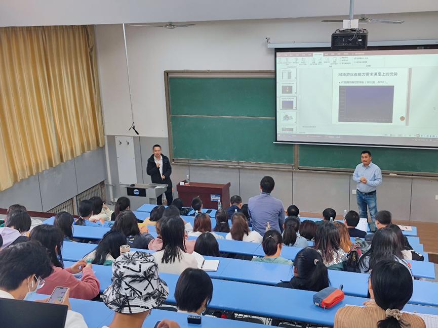 信阳师范学院魏华副教授应邀做了主题为《网络游戏,让我欢喜让我忧》的学术讲座。魏华以热门网络游戏为切入点,向同学们讲述了自己的游戏人生和学术人生,介绍了网络游戏风靡的原因、网络游戏成瘾的原因及预防措施,进而通过理性地分辨和思考让同学们真正了解网络游戏这一事物本身性质。在此基础上,他提出防止沉迷于网络游戏的建议,帮助同学们树立健康、理智应对网络游戏的态度,防止沉迷其中。