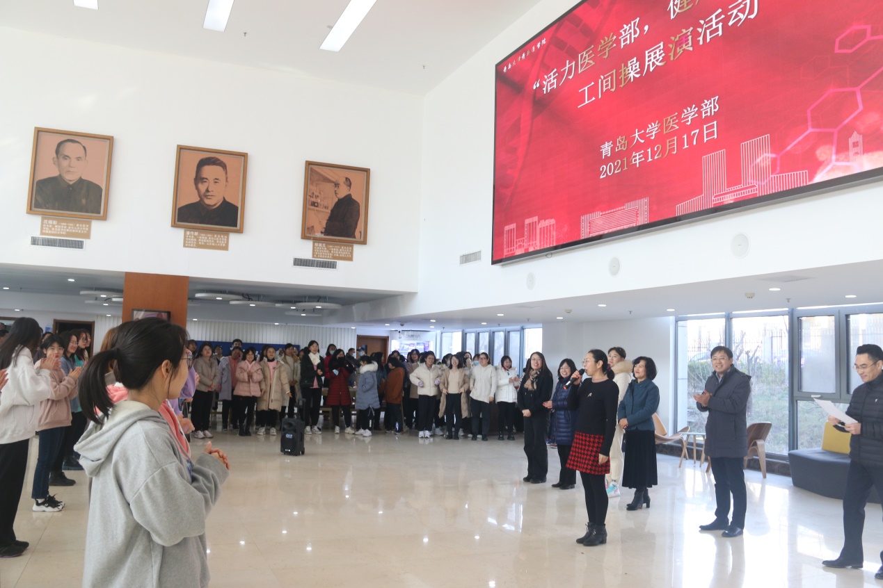 医学部党委副书记、工会主席于文洁强调工间操是广大教职工喜闻乐见的健身形式,在医学部教职医务员工中开展工间操展演活动是积极响应市总工会和校工会健身号召,强健教工体魄的一项有意义的活动。通过开展工间操活动鼓励老师们每天在紧张的工作之余,舒展身体开展工间操活动,倡导“快乐工作、健康生活”的理念,营造凝心聚力、奋发向上的工作氛围,让教职工们放松精神,缓解工作压力,以更加充沛的精力和更加饱满的热情投入到工作和生活中。今后学部将在每个工作日指定时间在医学教育综合楼1楼大厅播放工间操音乐,欢迎教职工们作为一项长期活动持续参与。