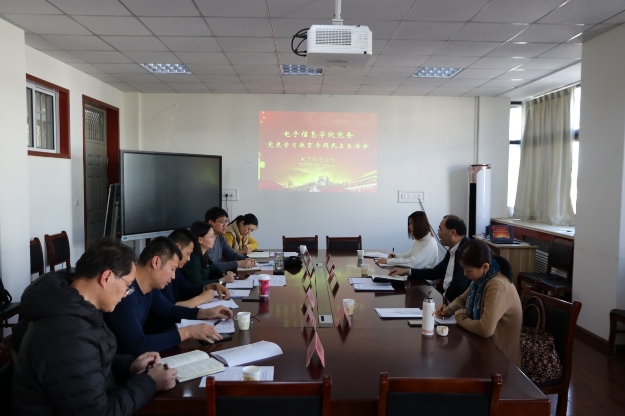 新闻网讯 1月9日上午,电子信息学院党委领导班子在诚思楼407会议室召开2021年度党史学习教育专题民主生活会,校党委常委、副校长孔伟金参会指导,党委正处级组织员赵秀凤,纪委(监察专员办公室)案件管理室主任纪皓瑛参会督导。会议由电子信息学院党委书记苗洪丽主持,学院党委班子成员参加会议,党外领导干部、系主任、支部书记列席会议。