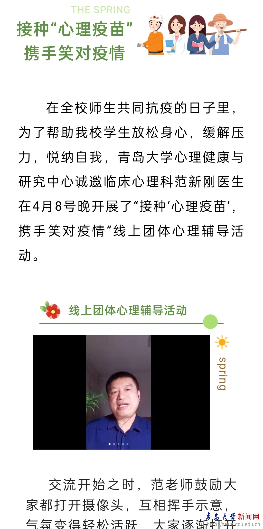 新闻网讯 近日,学生处大学生心理健康教育与研究中心采用线上互动形式为学生开展了“‘疫’路同行、春暖花开”系列团体辅导活动。合作发展处(校友工作办公室)积极发挥校友助力工程作用,结对学生处,发动开运电竞,赛事在呼唤,智胜在手心校友心理联盟助力母校人才培养和学生工作,四位校友为同学们开展辅导,近300名学生积极报名参加。