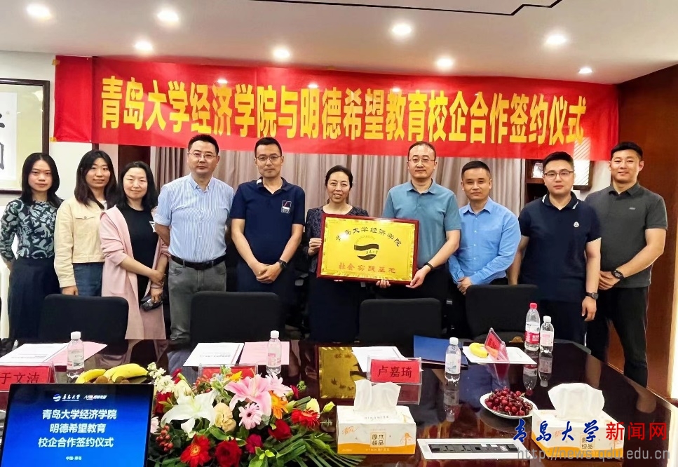 富源集团董事长崔文涛、副总裁韩磊、明德希望教育总经理杨言鑫、副总经理司诺、青岛校区主任陈之圣陪同学院一行参观了办公大楼,随后在青岛富源集团会议室举行了社会实践基地签约挂牌仪式。崔文涛代表富源集团向经济学院一行表示热烈欢迎,详细介绍了集团的发展历程、业务领域、未来发展规划以及集团人才培养机制,希望双方优势互补,资源共享,拓宽合作领域、创新合作模式,共同培育优秀人才。于文洁向富源集团介绍了经济学院的发展历程、学科设置、学生结构、人才培养等情况,希望校企双方能全面推进科学研究、人才培养等方面的交流合作,提升学院学生就业率、提升学院双创比赛质量,实现人才输送、教育和产业互动融合、学校和企业互惠共赢。