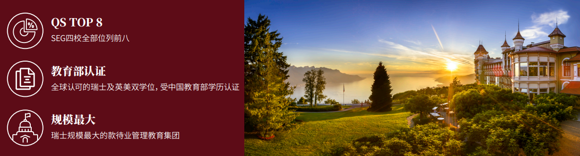 SEG是瑞士规模最大的款待业管理教育集团,旗下拥有全球款待业管理专业前十的四所顶尖大学,五大校区,有超过6000名学生报名这四所学校的课程。四校课程侧重点各有不同,但都拥有多样化的国际经验、本科及硕士课程,并提供不同岗位的全球带薪实习机会,学生可以从中获取宝贵的工作经验。