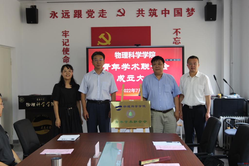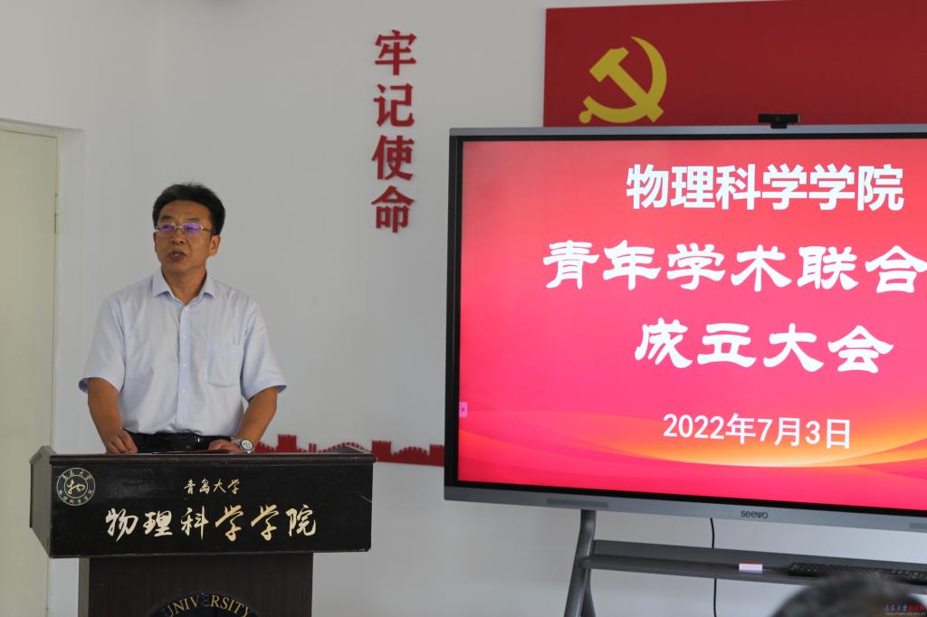 新闻网讯 7月3日上午,物理科学学院青年学术联合会成立大会暨学术报告会在博逸楼401举行。校党委常委、副校长于永明,山东大学晶体所常务副所长、国家杰青于浩海,科技处处长李荣贵出席大会。学院党委书记郝伟、院长滕冰及联合会成员、师生代表共50余人参加会议,会议由滕冰主持。