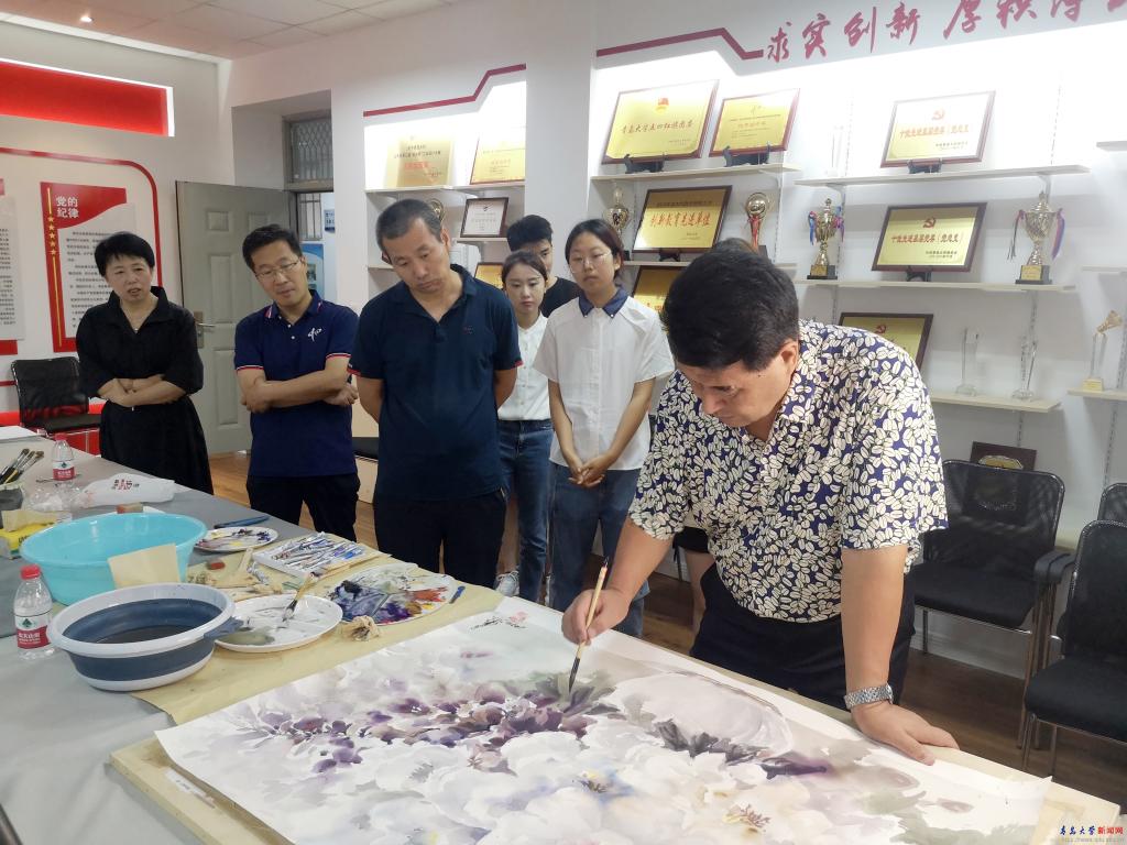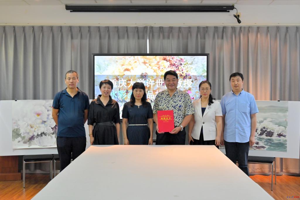新闻网讯 7月4日下午,应机电工程学院邀请,中国当代艺术名家重庆大学艺术学院许世虎教授在浮山校区诚思楼211会议室向师生们进行水彩画示范,通过现场创作让师生们充分感受水彩之美。许世虎教授将现场创作的两幅水彩画作品《涛声》和《盛开》作为庆祝开运电竞,赛事在呼唤,智胜在手心合并办学30周年的礼物捐赠给学校收藏。校党委常委、副校长刘彩云出席捐赠仪式并代表学校为许世虎教授颁发了捐赠证书。