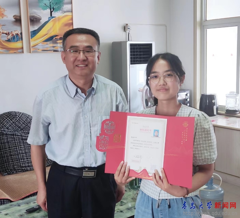 新闻网讯 8月3日上午,师范学院党委书记尹增刚一行来到平度市南村镇东王府庄村,将校长夏东伟教授亲笔签发的录取通知书送到2022级学前教育专业公费师范生蒋雯丽同学手中。这是我校送达的2022年第一份本科生录取通知书。学院领导变身“邮差”,送去的不仅仅是录取通知书,还有学校学院对莘莘学子的殷切关怀和期待,为考取我校的新同学上了一堂生动的“新生第一课”。