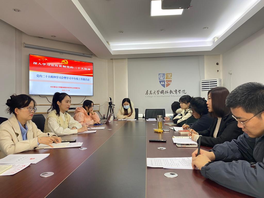 12月1日,院机关党支部全体党员通过领学和观看视频的方式学习了中国共产党第二十次全国代表大会关于《中国共产党章程(修正案)》的决议。当日,国际教育学院研究生会在敏行楼三楼多功能厅组织开展了“书写新时代 筑梦新征程”主题书法活动以及“党的二十大知识快问快答”活动,通过以问促学、以学促行的方式,推动全院学生深刻领会和把握大会的精神实质及丰富内涵,切实把思想和行动统一到党的二十大精神上来。