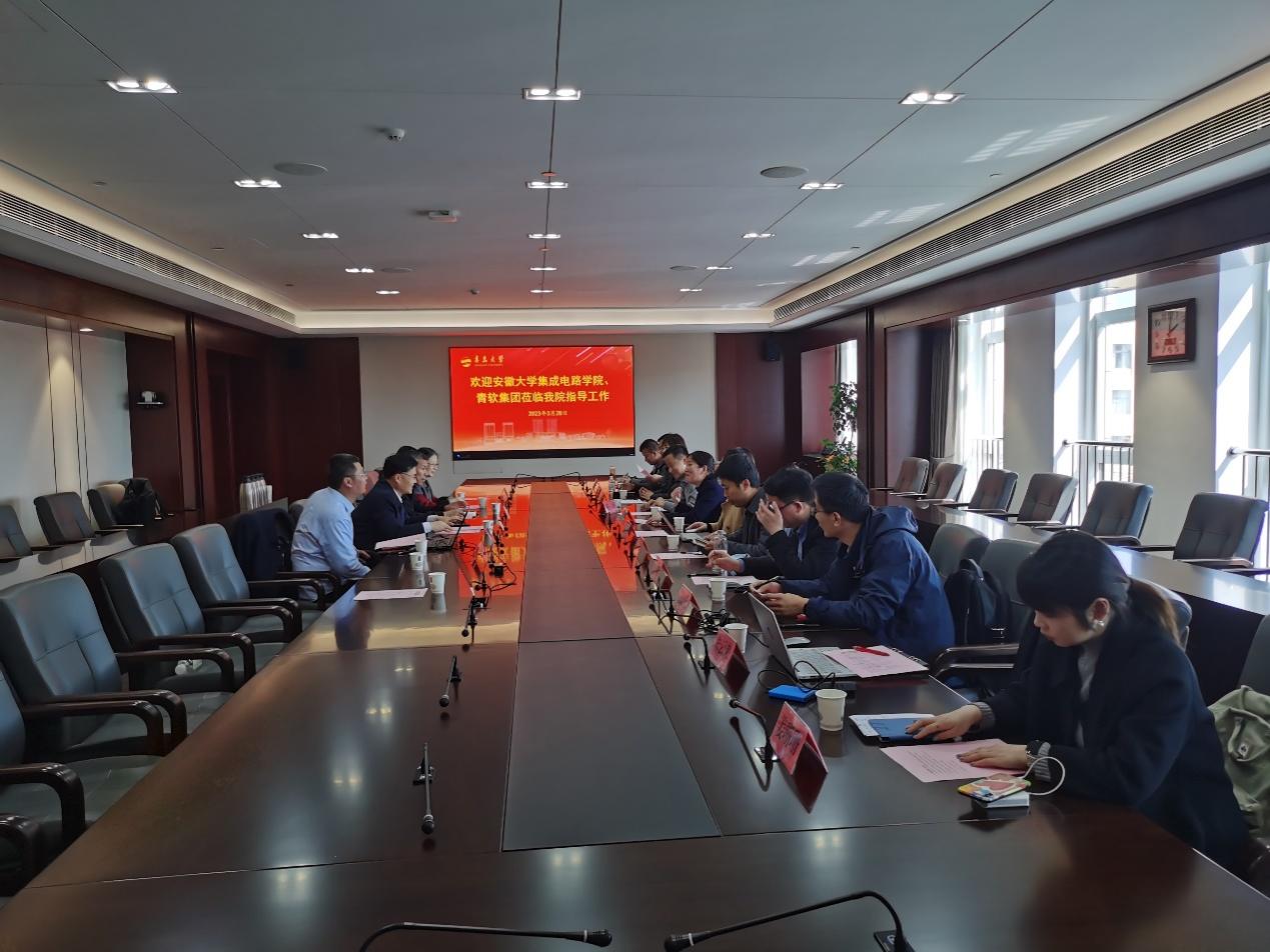 新闻网讯 为增进交流互动,促进教学、科研、人才培养和校企合作等方面的的共同进步,3月28日下午,安徽大学集成电路学院、青软集团一行到电子信息学院访问交流,座谈交流会在会议中心302举行,学院党委书记张启春及其他党政领导班子成员,相关科室负责人参加交流。