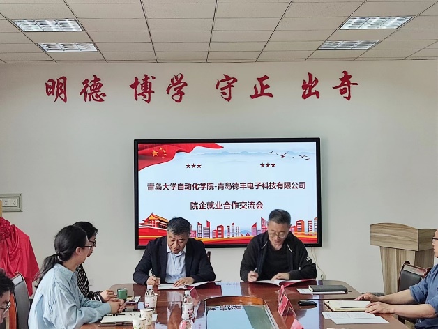 新闻网讯 5月26日上午,自动化学院与青岛德丰电子科技有限公司院企合作交流会在行思楼召开。会议邀请到青岛德丰电子科技有限公司总经理时彦彬等公司领导参会,期间双方就院企合作相关问题展开了交流。
