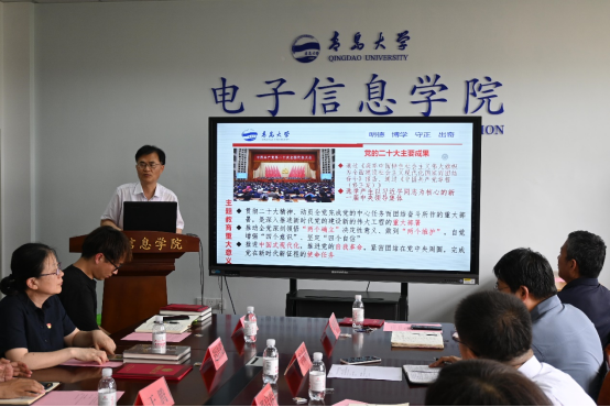 新闻网讯 6月29日下午,电子信息学院在诚思楼407会议室召开庆“七一”表彰座谈会暨书记讲党课活动,校主题教育督导组组长李升学出席会议,院系班子成员、教师党员、学生党员代表以及受表彰全体师生参会。