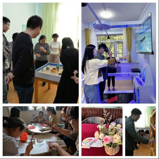 心理健康教育与研究中心主任米振宏介绍了中心秉承的工作理念“用专业温暖每一个心灵,让生命在此绽放”,她带领老师们参观了预约接待室、艺术治疗室、团体活动室、VR训练室、沙盘游戏室、心理测评室、宣泄室等功能室。米振宏结合自身工作经验从心理学入手,列举典型案例,深入浅出地讲解了师生心理健康的重要性以及青少年常见心理问题及应对。讲座结束后,老师们详细观摩并体验了插花、绘画、沙盘、互动游戏等相关功能室及活动。