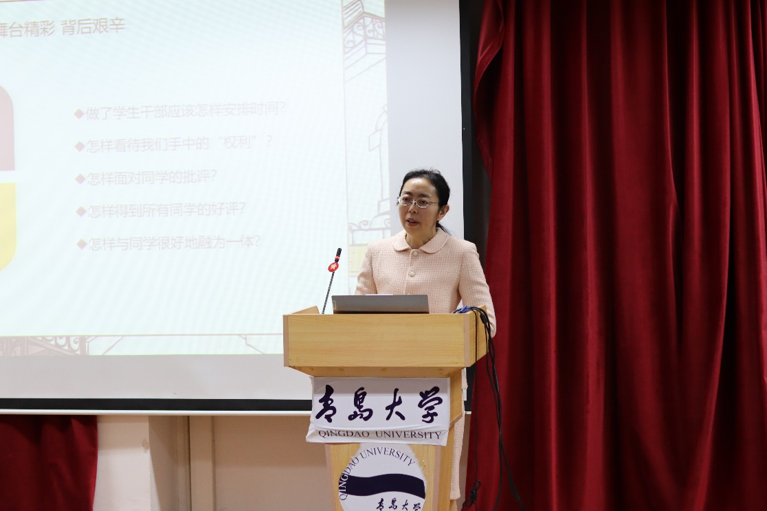 校团委副书记赵斐斐以“党建带团建视角下的青年成才路径”为题,向青年学生干部提出了新的发展方向和发展要求。青岛交警青平高速公路大队二中队指导员翟献敏为学生干部讲授交通安全知识,诙谐幽默的语言,结合具体事例,为学生干部的交通安全意识敲响警钟。文学院副教授张轶西以“国学智慧与修养”为题为学生干部们传授国学精粹,通过对儒家、佛家、道家思想的比较论述强调人伦、礼仪、德行的重要性,培养经院干部的国学修养和文化内涵,以国学润泽内心涵养,以文明接续青年奋斗火花。经济学院党委副书记于文洁以“牢记职责使命,创造青春业绩”为主题,从为什么要当学生干部,怎么当好学生干部引入主题,结合自己多年的学生干部经历以及学生工作管理经验,从学生干部应具备的精神、要把握的关键、该承担的责任等方面进行了论述。经济学院优秀团支书代表和优秀学生代表,结合自身经历与营员们分享班级建设、个人成长与未来发展的切实体会。