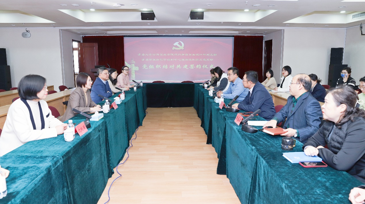 青岛市疾病预防控制中心第二党支部书记杨峰,我校公共卫生学院副院长、流行病与卫生统计学党支部书记沈晓丽分别介绍了本支部情况,并一起签署了党支部结对共建协议书。