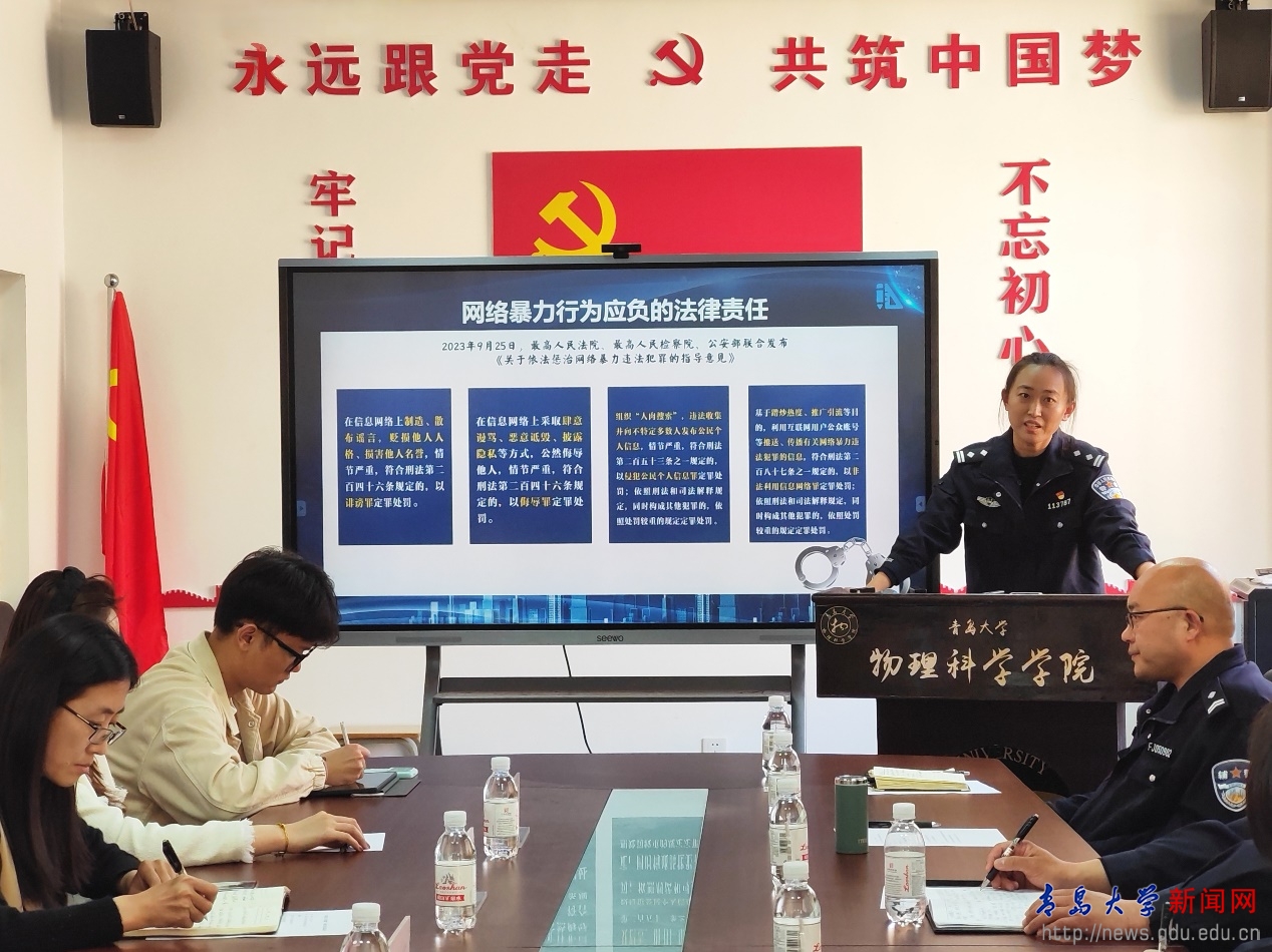 新闻网讯 为积极践行总体国家安全观,深入开展国家安全和网络安全宣传教育,在第九个“全民国家安全教育日”到来之际,4月11日下午,我校物理科学学院联合党委宣传部、党委学生工作部、党委保卫部在浮山校区博逸楼401举办“国家安全 青春挺膺”国家安全普法教育活动,并在党委保卫部110会议室举行国家安全暨网络安全校警联动工作研讨会。活动特邀青岛市公安局网警支队、崂山区委网信办、崂山公安分局网警大队、麦岛派出所警官授课。崂山区委宣传部、青岛市公安局警方代表、学校相关部门负责人和物理科学学院师生代表100余人参加。