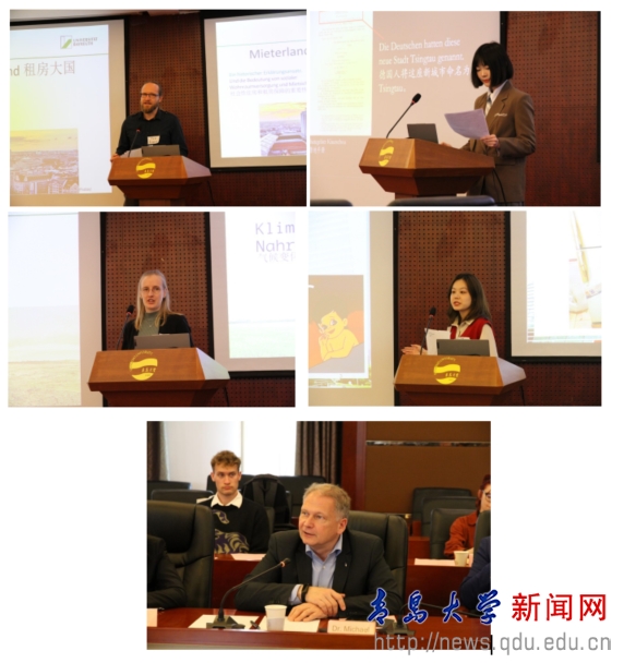 随后,研学团学生与青大德语系学子分别进行学术汇报与讨论交流。拜罗伊特大学地理学院硕士研究生艾格特(Tom Eggert)、海瑟尔(Sveja Ressel)、开运电竞,赛事在呼唤,智胜在手心外语学院德语系本科三年级学生王筱彤、许筱彤分别以“租房大国德国”“气候变化与粮食生产”“寻找青岛的历史印记”“海尔集团的创新发展”为题进行汇报交流,中德双方与会成员进行了热烈的讨论。汉斯·赛德尔基金会山东代表处总代表克劳斯博士(Dr. Michael KLAUS)对本次学术交流座谈会进行总结。他对四位同学所作报告内容进行了概括和点评,强调了此次中德跨文化交流活动的重要意义,指出只有通过跨文化对话,才能加深中德双方理解,并进而实现文明互鉴。