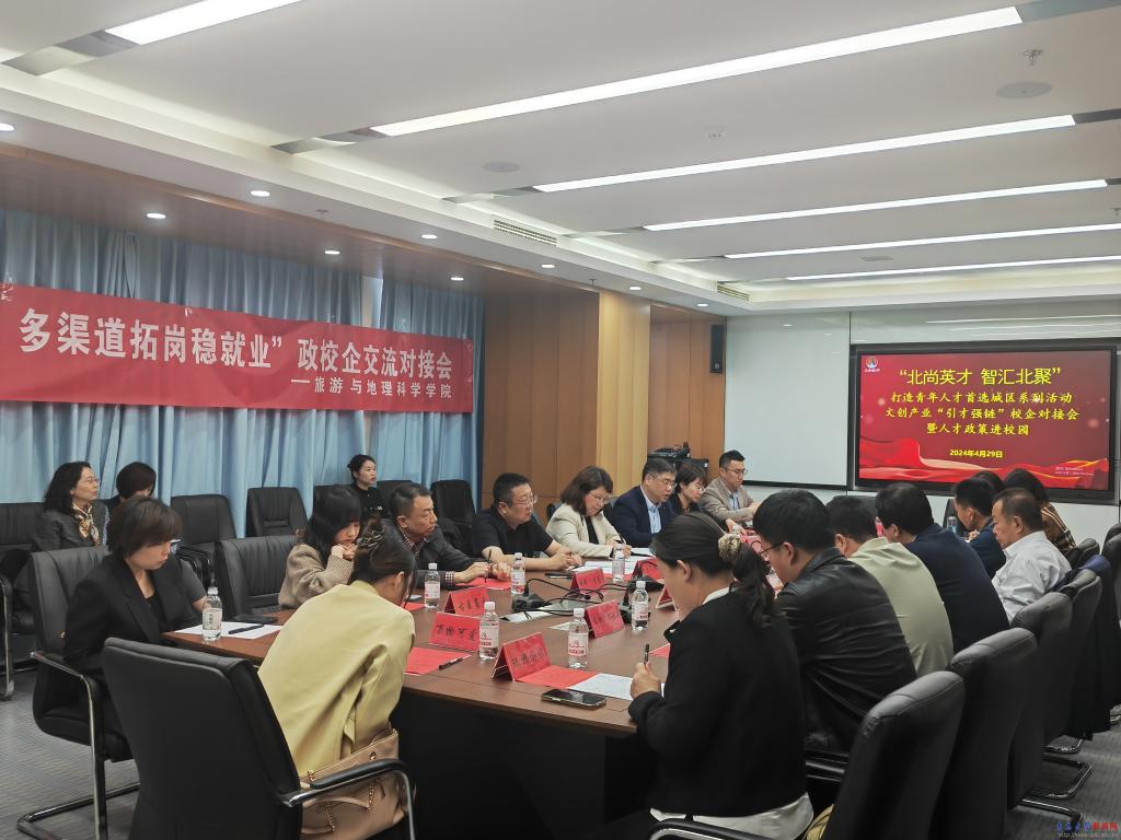 新闻网讯 为抢抓就业关键时期,做好毕业生与用人单位的精准对接,旅游与地理科学学院于4月29日举办“政校企三方聚合力,多渠道拓岗稳就业”政校企交流对接会暨市北区文旅企业专场招聘会。市北区文旅局局长张玮,市北区公共就业和人才服务中心负责同志,十余家企业负责人,学院党委书记刘善东等党政领导参加活动。