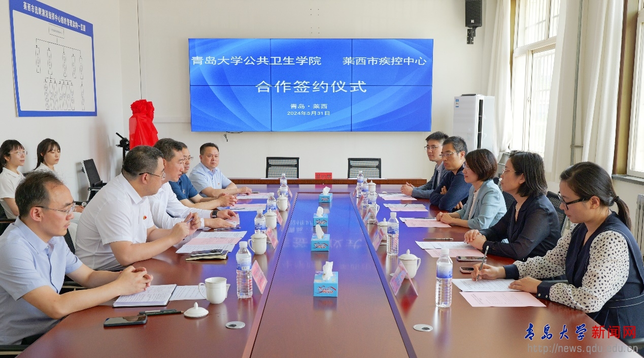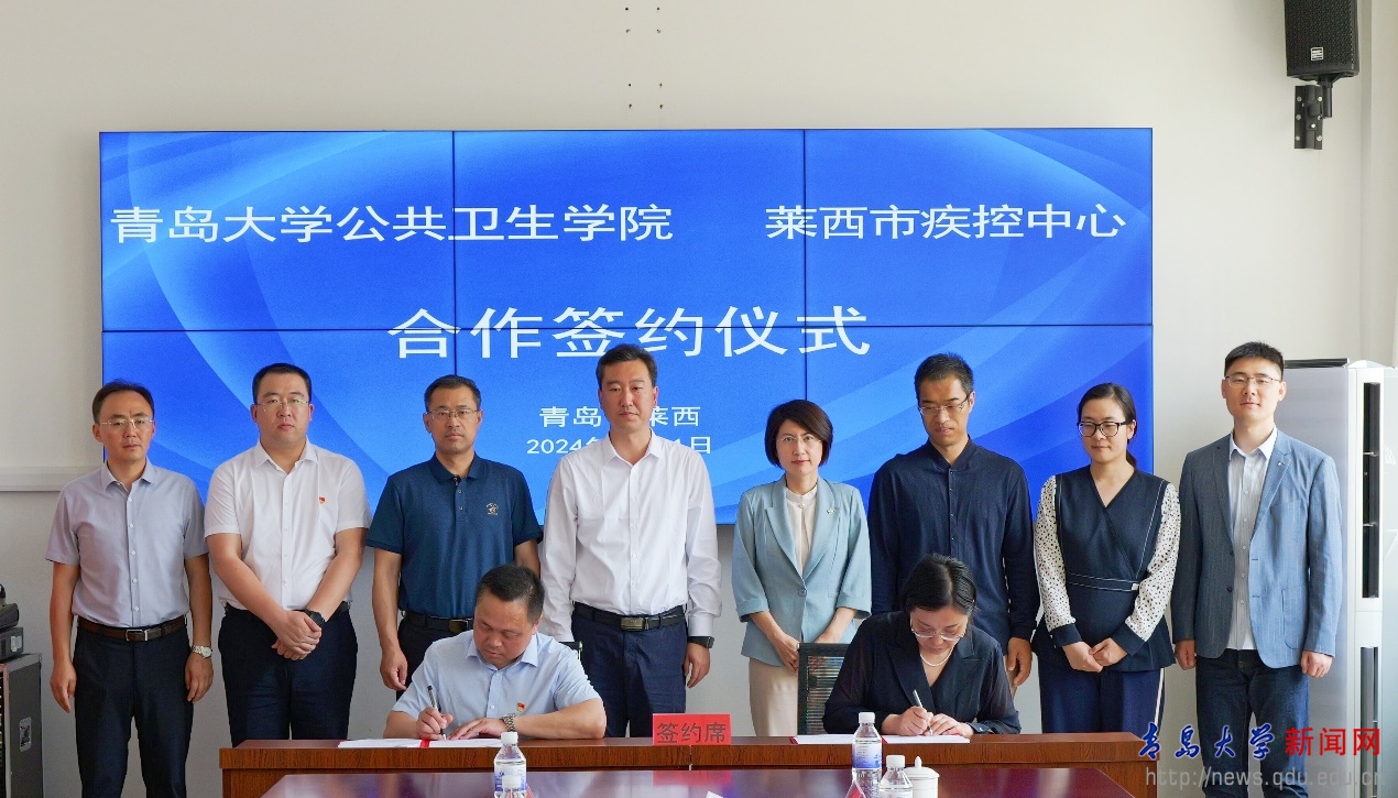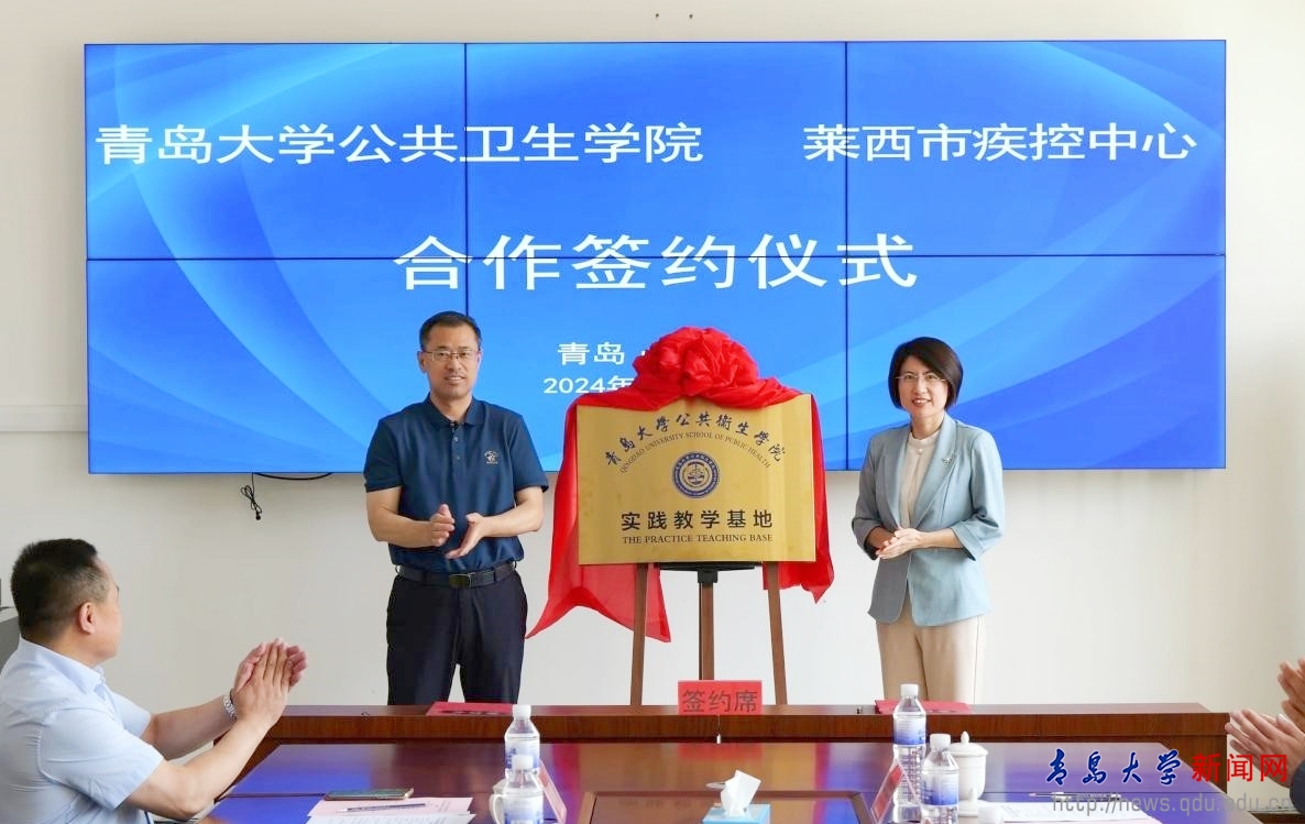 新闻网讯 近日,我校公共卫生学院与青岛莱西市疾病预防控制中心共建实践教学基地签约揭牌仪式在莱西举行。莱西市委常委、统战部部长、副市长张鹏;莱西市卫生健康局党组书记、局长于建波,党组成员、副局长、疾控局局长郑福刚;莱西市疾病预防控制中心党总支书记朱化儒,主任王庆玺及相关部门负责人;我校公共卫生学院党政负责人及相关专家、学者共同参加签约仪式。仪式由郑福刚主持。