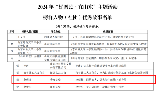 新闻网讯 7月15日,2024年“好网民·在山东”优秀故事评选结果公布,材料科学与工程学院辅导员李明栋入选榜样人物优秀故事名单。