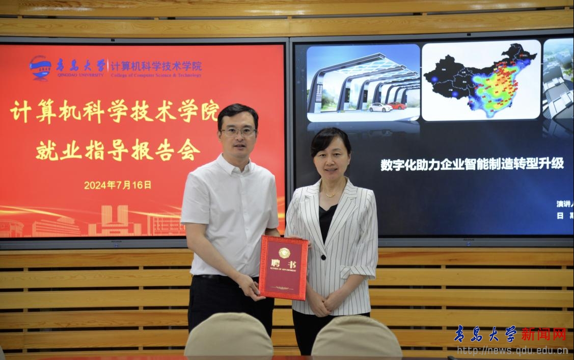 新闻网讯 为进一步推进2025届毕业生就业指导工作,引导学生树立正确的就业观念,提高就业积极主动性。7月16日下午,计算机科学技术学院在博知楼510会议室举行就业指导报告会。青岛特锐德电气股份有限公司副总裁、2001级校友李广智应邀作题为《数字化助力企业智能制造转型升级》的报告。院党委书记潘秋鸿参加会议,会议由院党委副书记周鹏主持。