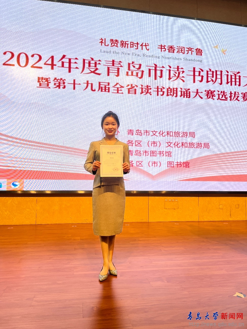 新闻网讯 近日,“礼赞新时代,书香润齐鲁”青岛市读书朗诵大赛在青岛市图书馆隆重举行。大赛旨在弘扬优秀文化,激发市民阅读热情,营造浓厚的文化氛围。我校经济学院2022级学生周佳仪,凭借其卓越的朗诵才华与不懈的努力,从众多选手中脱颖而出,代表崂山区图书馆参赛,并最终荣获市级三等奖。