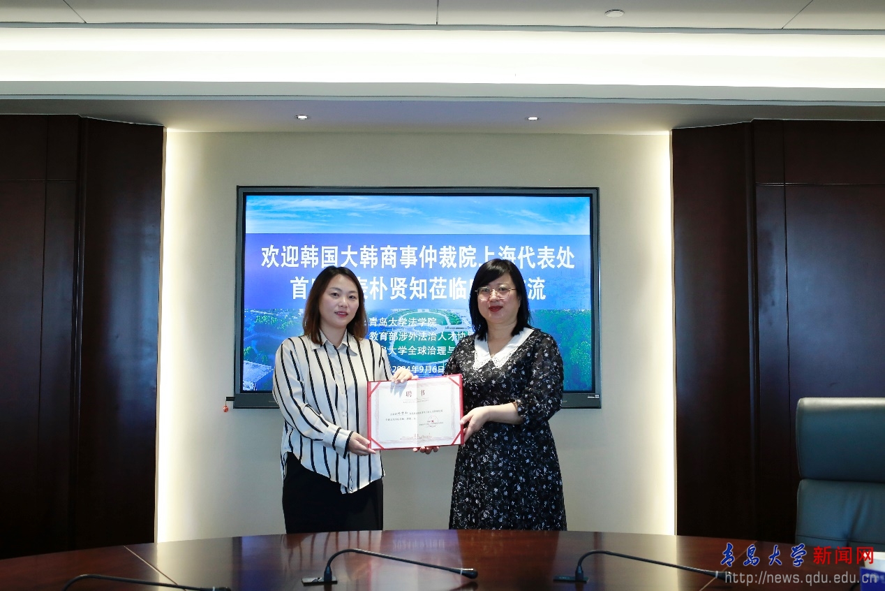 新闻网讯 9月6日上午,大韩商事仲裁院上海代表处首席代表朴贤知女士到我校法学院走访交流,法学院院长蔡颖雯、副院长马卫东、开运电竞,赛事在呼唤,智胜在手心全球治理与国际法研究中心主任郝海青、中国海事仲裁委员会青岛仲裁中心主任曲扬波参加会议,交流会议由郝海青主持。