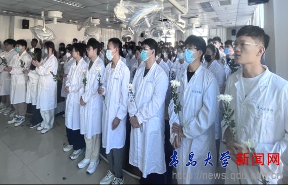 学院王双燕老师带领同学们宣读了解剖学誓词。铮铮誓言,既是对无语老师的感恩和敬意,更是对医学生们学习奋进的鞭策和激励。伴随着肃穆的音乐,老师和同学们手捧菊花,满怀感恩与敬畏之心,庄重地向“无语良师”们敬献鲜花,静默悼念,以表达对他们深深的敬意和无尽的感恩。