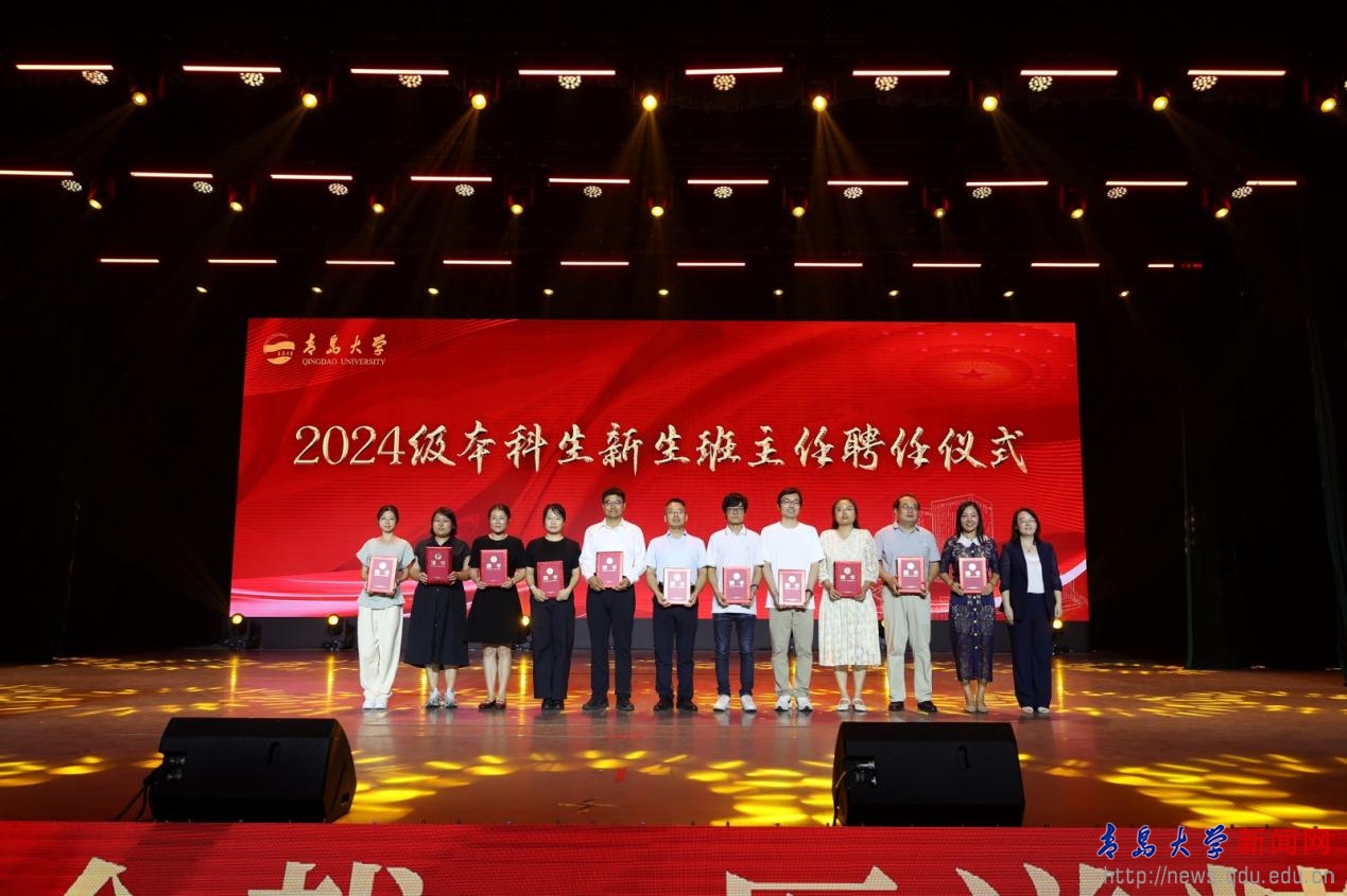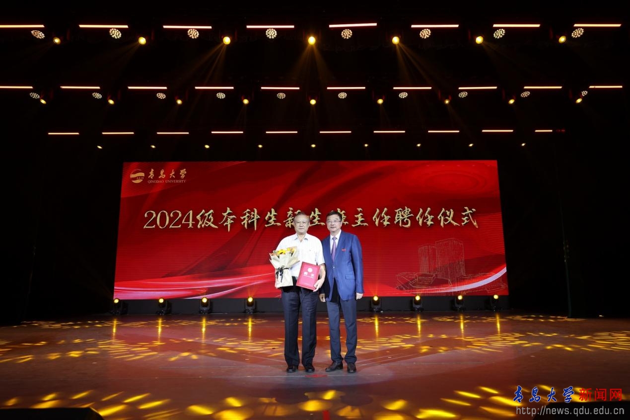 青岛医学院副院长李冰为2024 级本科生新生班主任颁发聘书。党委书记蒋光峰为临床医学“5+3”一体化沈福彭班校外班主任沈毅教授颁发聘书。
