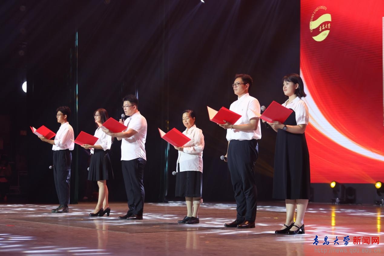 授袍仪式后,青岛医学院副院长(主持工作)任贺带领全体新生宣读《医学生誓言》。誓言铿锵,在剧院里久久回荡,激励着在场的每一位同学。师生们还呈现了丰富精彩的歌舞节目。开学典礼在《我爱你中国》《青大之歌》的歌声中落下帷幕。