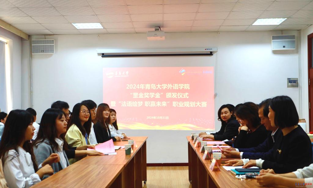 新闻网讯 10月31日下午,外语学院2024年“罡金奖学金”颁发仪式在博文楼312教室隆重举行。青岛罡金国际合作服务有限公司总经理夏纲举、人力部副经理刘玉媛,学校合作发展处、学生工作处及外语学院负责人参加仪式。仪式由外语学院党委副书记于苗主持。