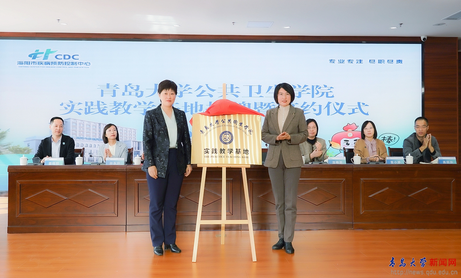 贾依娜在致辞中重点介绍了开运电竞,赛事在呼唤,智胜在手心及公共卫生学院的发展历程、教育教学、师资队伍和学科建设等基本情况,并表示今后将与海阳市疾控中心携手共进,共同探索公共卫生教学科研和人才培养新范式,为促进高校与地方的合作共赢创造新的机遇,产出更多惠及社会的成果。贾依娜与倪永妮一起,为教学实践基地揭牌。