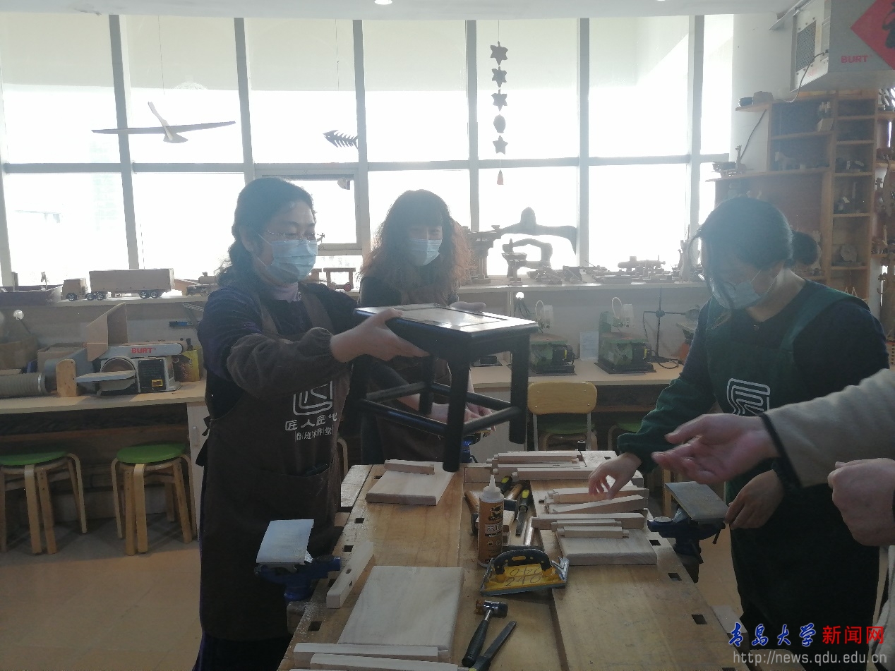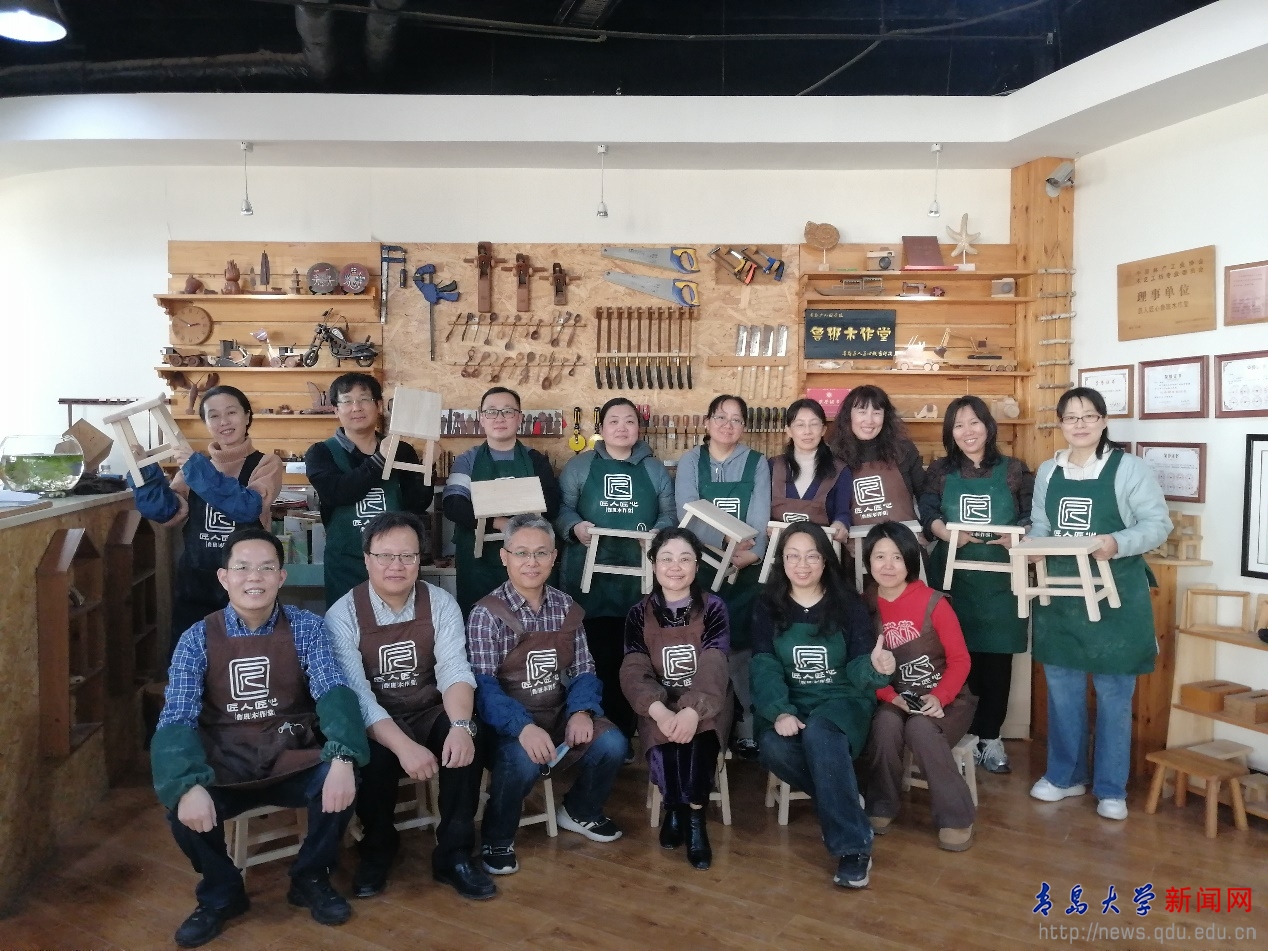 本次活动中,学院教职工走进“鲁班木作堂”,在木工专家的讲解指导下亲手制作木工小板凳。通过木块打磨、榫卯拼接、乳胶加固、插接成型、后期修整等工艺流程,大家都成功地完成了自己的作品。