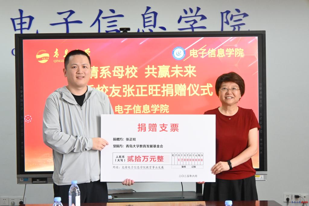 张正旺校友向学院捐赠人民币20万元整,用于支持通信工程专业发展和学院校友工作的开展,这笔善款饱含校友对母校的深厚情谊和对教育事业的坚定支持,寄托着对专业和学院未来发展的殷切期望。