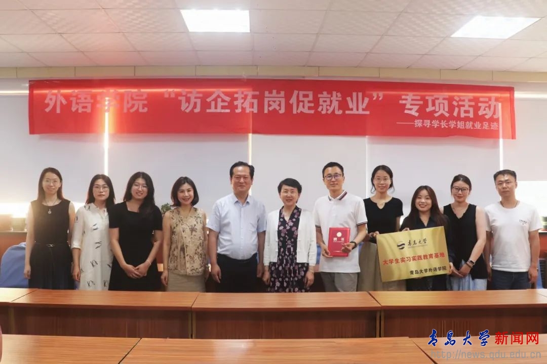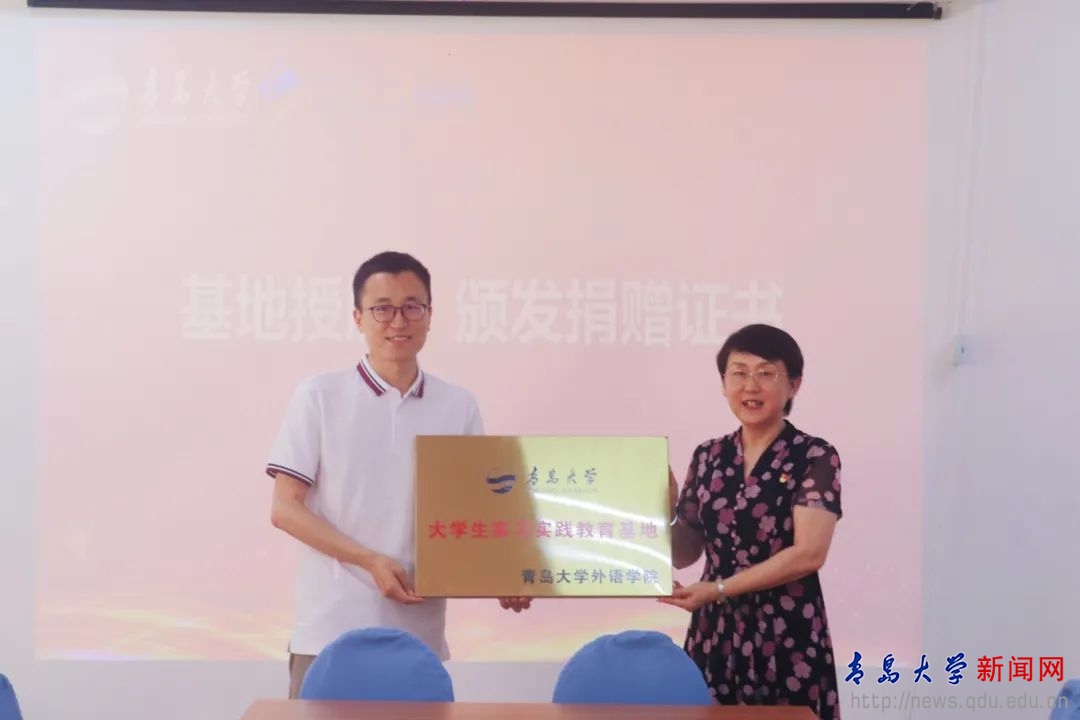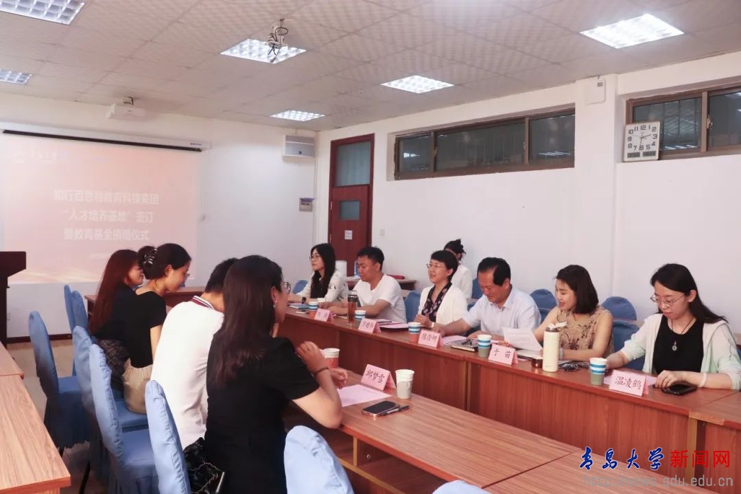 新闻网讯 为构建校企资源共享平台,助力学生高质量就业及全面发展,7月3日下午,外语学院在浮山校区博文楼312室举行知行百思特教育科技集团“人才培养基地”签订暨教育基金捐赠仪式。知行教育董事长吴泽、青岛校区校长李兆君、人事经理邱梦雪、教师王金丽,外语学院党委书记陈崇研、院长卞建华以及外语学院学工办负责人、辅导员出席仪式。仪式由外语学院党委副书记于苗主持。