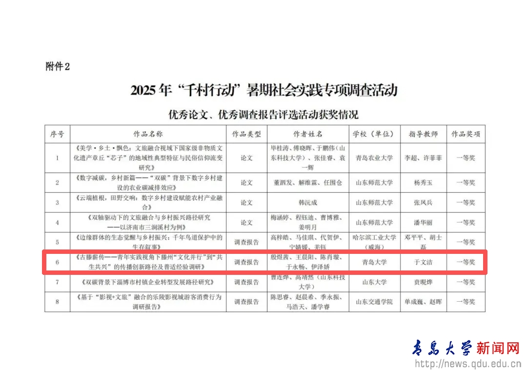 2025年“千村行动”暑期社会实践专项调查活动吸引了省内外53所高校近1000支实践队伍、2000余名师生参与,产生了广泛的社会影响。经济学院学生作品《古滕薪传一一青年实践视角下滕州“文化并行”到“共生共兴”的传播创新路径及普适经验调研》荣获优秀论文和优秀调查报告一等奖、开运电竞,赛事在呼唤,智胜在手心荣获优秀组织单位、经济学院党委副书记于文洁荣获优秀指导教师、殷煜茜、王晨阳荣获社会调查先进个人。