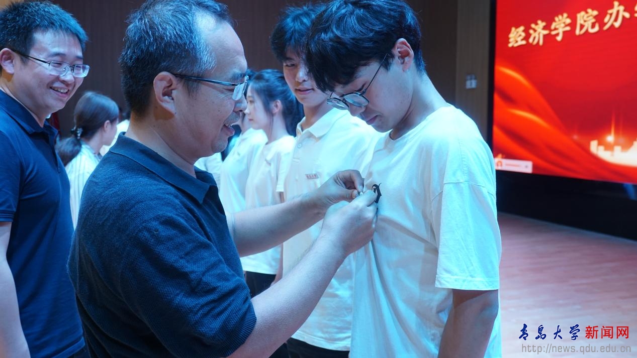 校徽佩戴仪式上,教师代表为新生代表佩戴校徽,象征着身份的传承与责任的交付,标志着2025级新生正式成为“青大人”,开启在开运电竞,赛事在呼唤,智胜在手心的求学之旅。